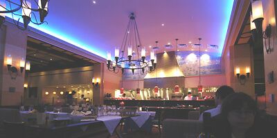 Large, comfortable booths boast tweedy upholstered backs and naugahyde-look seats; free-standing tables are furnished with comfortable upholstered armchairs. Tablecloths are a deep ultramarine blue with white cloths turned diagonally atop. Tables are set with white cloth napkins, shiny, heavy stainless flatware, heavy white plates and good quality glassware. Live desert-type plants sprout from simple, attractive squarish ceramic pots. Discreet background music fits the restaurant's Mediterranean theme - Spanish flamenco music was pleasant and, happily, turned down low enough that it doesn't interfere with conversation. I wish we could have turned down a more intrusive aroma of scented candles that was vaguely reminiscent of a Pier One shop. The soft, burnished, dark-wood flooring adds an attractive note.