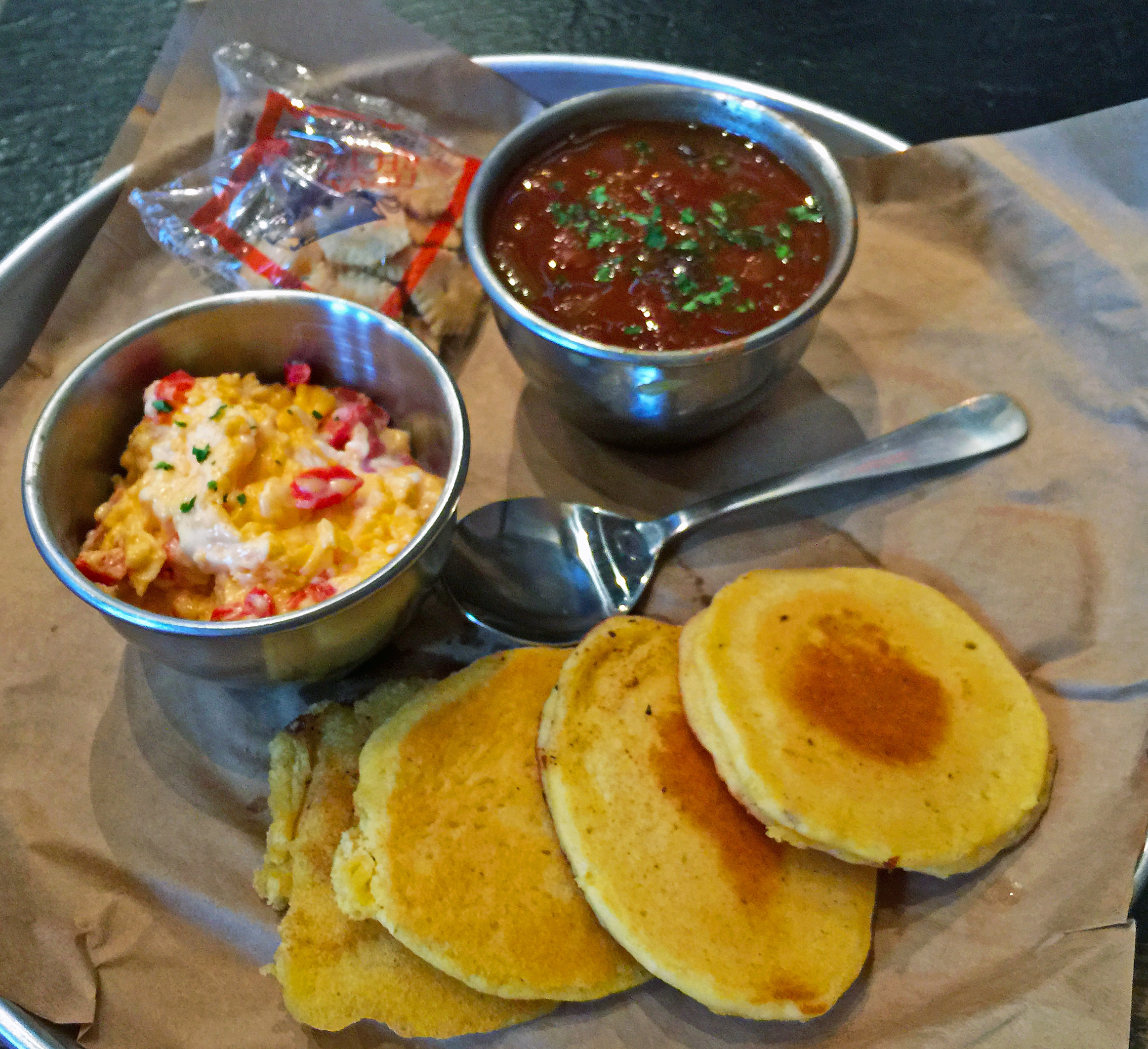 Against the Grain’s cornbread hoecakes with homemade pimento cheese, and a cup of black-bean chili