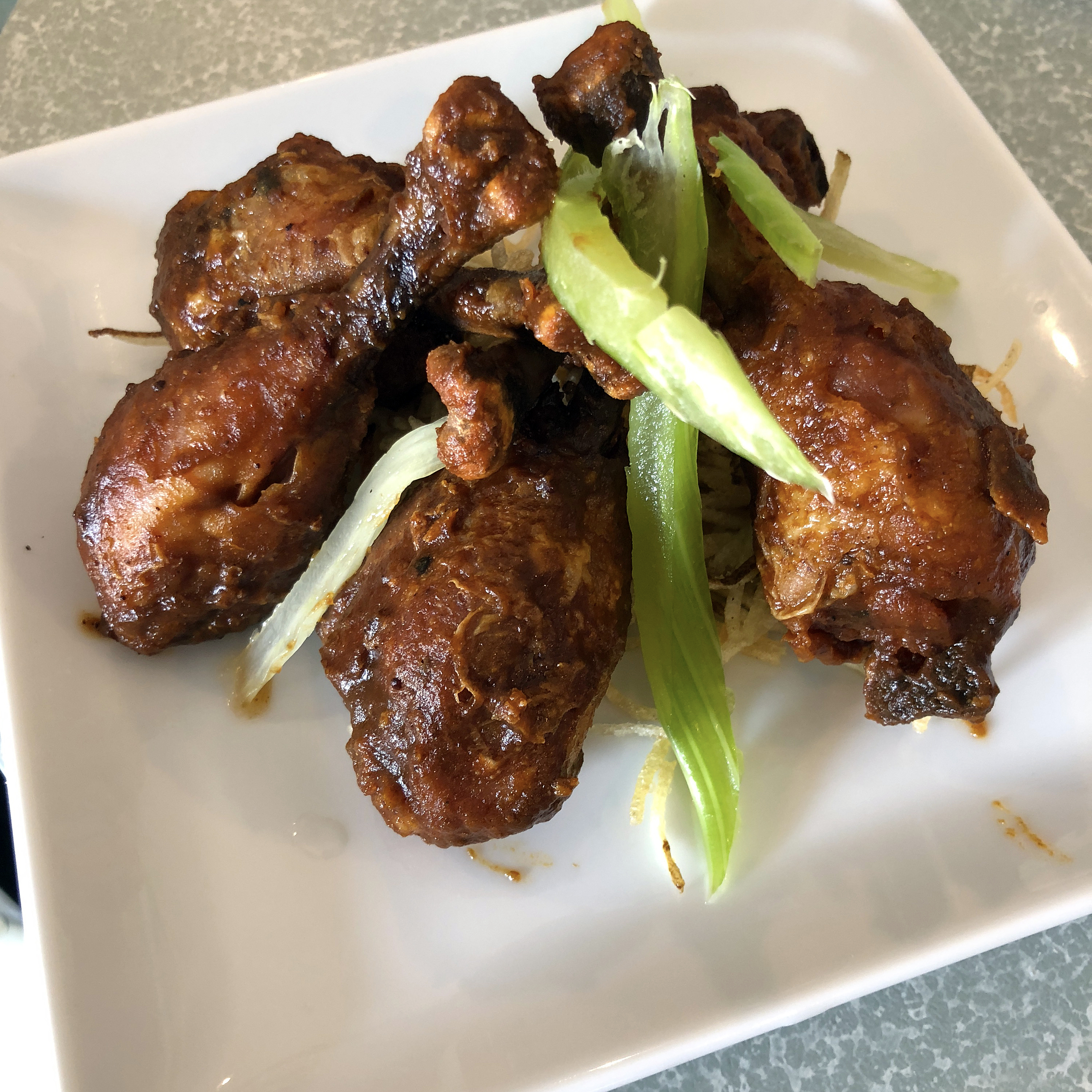 The 80/20 burger ($14.50), heir to the Kaelin’s original cheeseburger, pictured at the top of the page, was exceptionally tasty. Made from three cuts of beef ground in-house, it was juicy and flavorful, hot-pink medium-rare as ordered. The pretzel bun showed grill marks. Dressings were unexceptional: A halved yellow tomato slice, a rather tough ring of raw onion, a couple of small pieces of ghost-pepper bacon, barely piquant despite the pepper’s fierce reputation, and thin yellow aioli-like 80/20 sauce. It was such an ample sandwich that it couldn’t easily be picked up and eaten; better to deconstruct it with knife and fork.