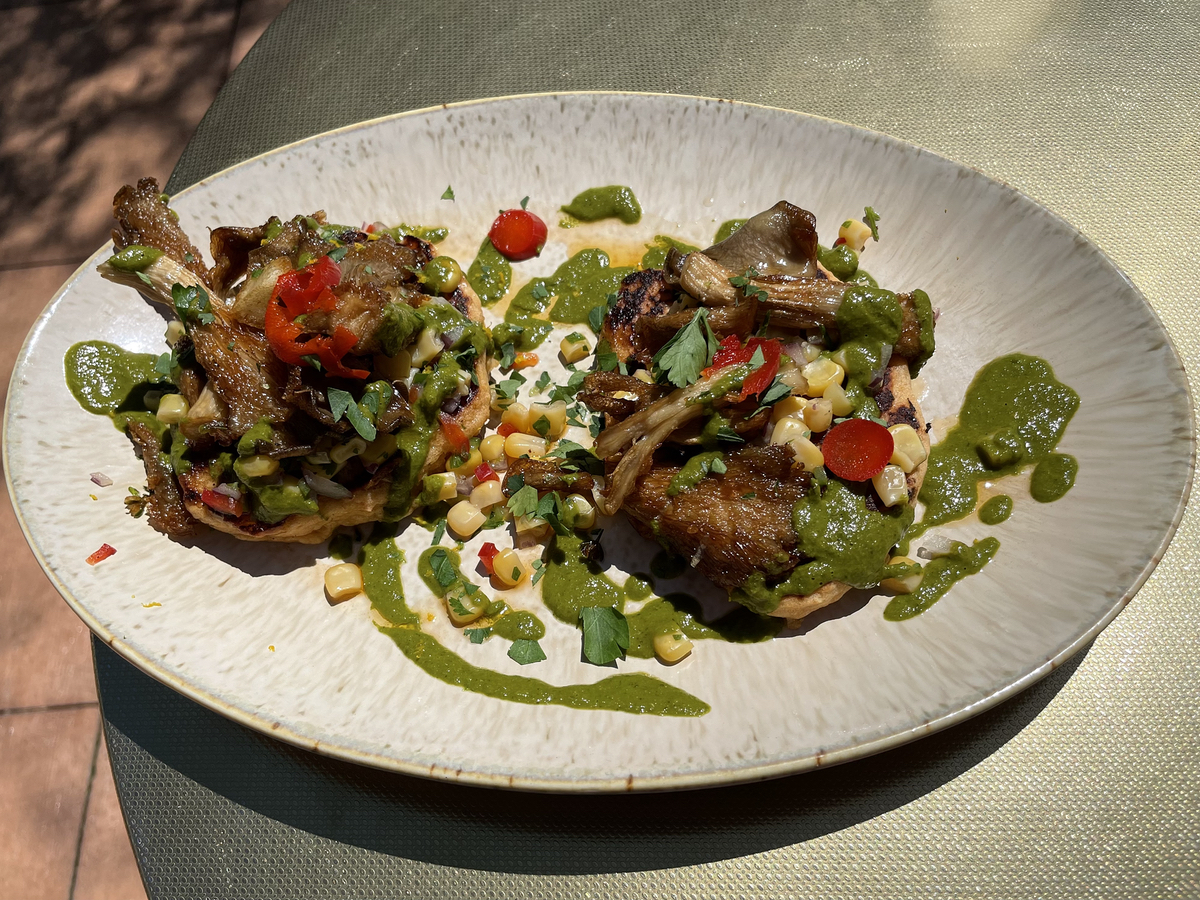Chewy and flavorful corn cakes topped with wild mushrooms, corn kernels, and crunchy goodies made a palate-wakening appetizer.
