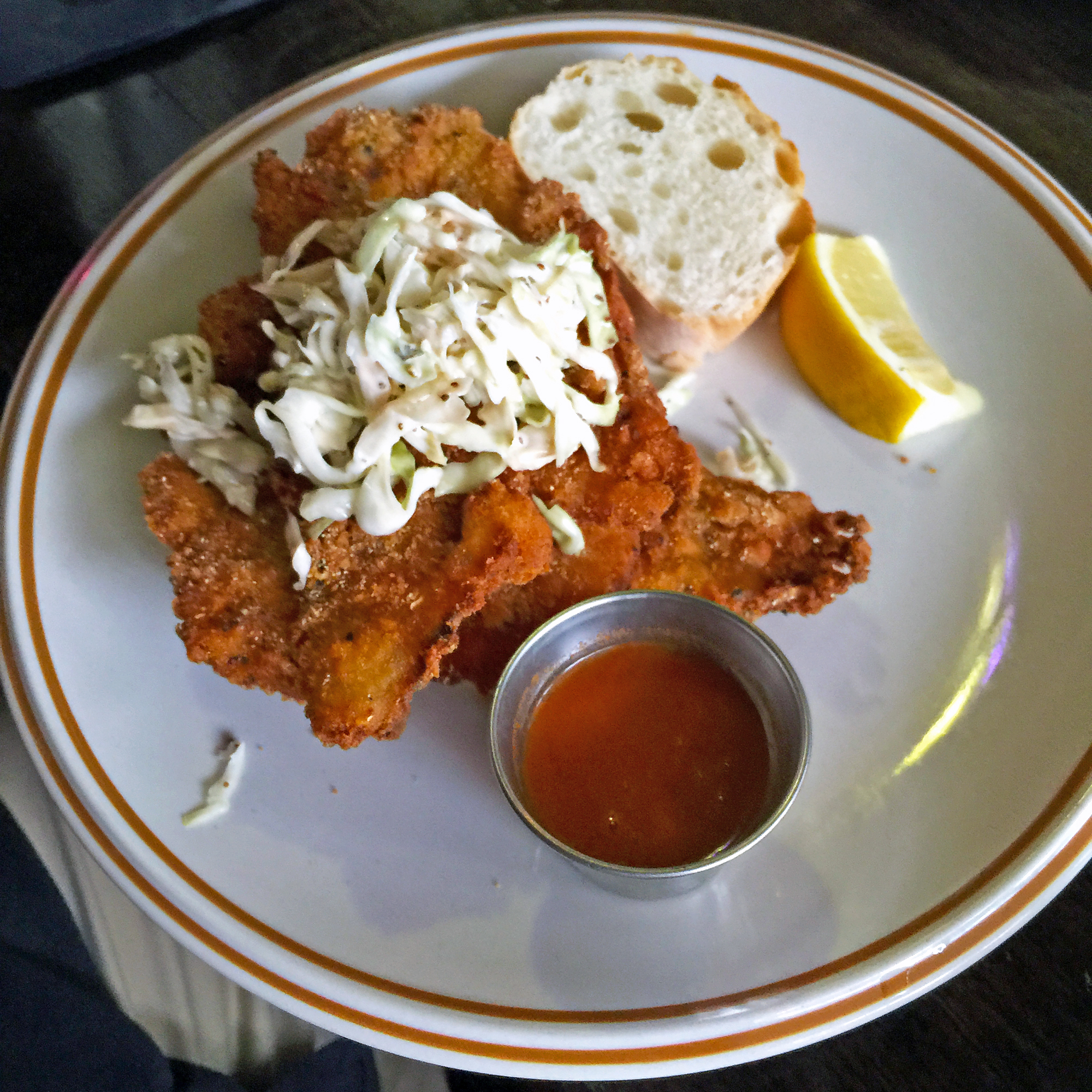 Roux’ “shaved” fried catfish