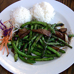 It’s almost impossible to believe that the dark-brown, “meaty” squares of “mock duck” in dau dua xào ($9.50) weren’t carved from a living, quacking being, but close examination reveals that it’s really a vegetable substance – marinated tofu, maybe, or wheat gluten. Stir-fried with crisp-tender green beans in a spicy black-bean sauce, it’s another dish that could fool a meat-eater into thinking he had the real thing on his plate.
